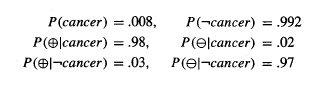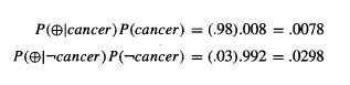 Posterior를 계산한 결과, '+'(양성)일 때, cancer(암)에 걸릴 확률보다 그렇지 않을 확률이 더 크기 때문에,