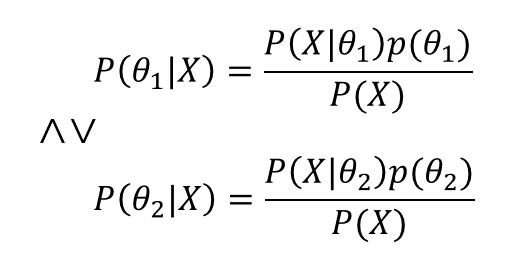 여기서 P(Θ1|X)(observation X가 주어졌을 때, 클래스1일 확률)과 P(Θ2|X)(observation X가 주어졌을 때, 클래스2일 확률) 둘 중 더 큰 확률을 가지는 클래스를 고르면 observation에 대한 클래스를 고를 수 있을 것이다.