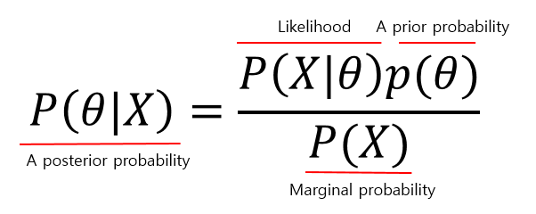 - A posterior probability(사후확률) P(Θ|X): observation이 주어졌을 때의 hypothesis의 분포를 뜻한다. 얘같은 경우에는 데이터 X의 영향을 반영하는 애다.