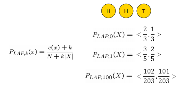 이렇게 원래 확률이 0이 될 feature에 대해 어떤 값을 더해주어 전체를 0으로 만들어버리는 불상사를 막아준다. 그리고 k에 따라 smoothing정도가 달라질 것이다. smoothing이라는 말을 이해해보기 위해 동전던지기 확률에 laplace smoothing을 적용해보면,