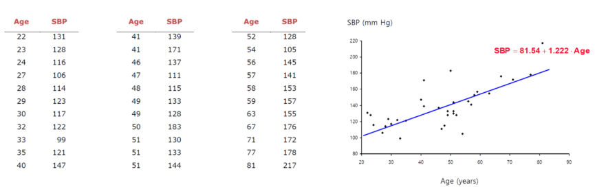 쉬운 예제로 나이(x)를 통해 혈압(y)를 예측하려고 한다면, 직선을 쭉 그어서 데이터를 잘 표현 할 수 있다.
