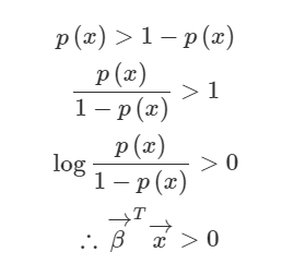 이렇게 조건부확률을 logistic function을 이용해 구해봤다. 이를 이용해 이제 classification을 할 수 있다. 그걸 어떻게 하는지 이제 알아보도록 하자. classification에서는 decision boundary(decision surface)라는 경계를 바탕으로 구역을 나누게 된다. 지금 살펴본 것은 Y=0,1로 두개의 class가 있기때문에 두 영역을 구분하는 decision rule을 만들어보자. Y=1로 분류하고 싶다면, 가장 간단하게 할 수 있는 방식은 아래와 같다.