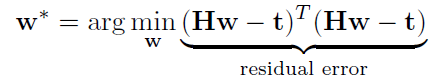 이를 원래의 target 값인 t(x)와의 차이의 제곱을 최소화 하는 weight를 찾으면 모델을 완성할 수 있다. 이렇게 single input으로 x값이 하나만 들어올 수도 있지만, 사실 input으로 들어오는 데이터는 여러 feature들을 갖는 벡터형태로 들어오게 된다. 벡터형태로 들어오게 될 경우로 general하게 weight를 구해보면 제곱의 합을 최소화 하는 방식으로 weight vector를 찾을 수 있다.