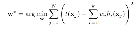 그럼 포물선 형태로 모델링을 했는데 왜 linear regression이냐... 할 수 있지만, 기저함수와 weight의 선형조합으로 target값을 예측했다는 것을 알 수 있다. 그래서 이런 모델링을 linear regression이라고 한다. 좀 더 general하게 추정한 값을 식으로 정리하면 아래와 같다.