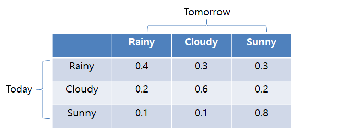 3)가정: 오늘날씨(current state)는 어제날씨(previous state)에만 영향을 받는다. (1차 마르코프모델)