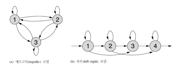 계산최적화에 대해서는 따로 다루지 않겠다. MM은 대략적 개념을 알고 HMM에 대해 더 자세히 알아볼 것이기 때문이다..... 마지막으로 마르코프모델의 종류를 언급하고 넘어가겠다. 마르코프모델은 state transition(상태천이)의 형태에 따라 날씨모델과 같은 에르고딕 모델과 음성인식에 많이 적용되는 좌우모델이 있다.