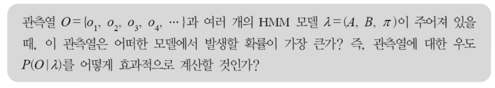 주어진 모델에서 관측열이 출력될 확률이 얼마인지 효과적으로 계산할 수 있어야한다. 그 확률값에 따라 최적의 모델을 다수의 모델로부터 선택할 수 있기 때문이다.