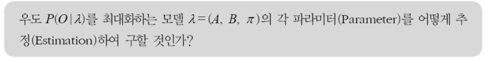 어떤 모델에서 발생한 관측열의 집합이 주어질 때, 이 관측열을 가장 잘 설명하는 모델의 파라미터들을 어떻게 최적화하여 구할지의 문제이다. 모델에 대해서 관측열의 출력이 최대가 되도록 모델의 파라미터를 조절하는 문제이다. HMM응용분야에서 성능을 결정하는 중요한 사항이다.