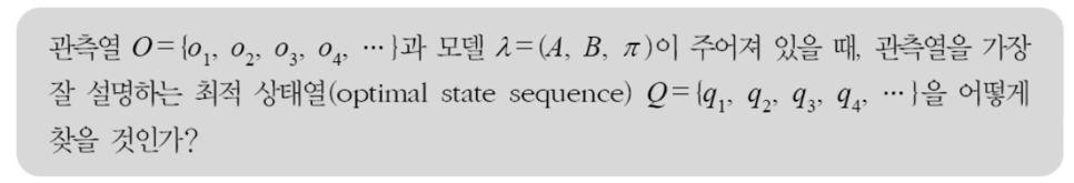 관측열로부터 정확한 상태열을 알아내는 것은 어렵겠지만, 가장 최적의 숨겨져있는 상태열을 찾아내고싶을 때 어떻게 찾을지에 대한 문제이다.