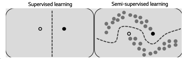적은 labeled data가 있으면서 추가로 활용할 수 있는 대용량의 unlabeled data가 있다면 semi-supervised learning을 고려할 수 있다. Semi-supervised learning (준지도학습)은 소량의 labeled data에는 supervised learning을 적용하고 대용량 unlabeled data에는 unsupervised learning을 적용해 추가적인 성능향상을 목표로 하는 방법론이다. 이런 방법론에 내재되는 믿음은 label을 맞추는 모델에서 벗어나 데이터 자체의 본질적인 특성이 모델링 된다면 소량의 labeled data를 통한 약간의 가이드로 일반화 성능을 끌어올릴 수 있다는 것이다. (아래의 그림에서도 확인할 수 있듯이 왼쪽에 supervised learning과 오른쪽 semi-supervised learning을 비교해보면 supervised learning의 decision boundary는 사실상 optimal하지 않다. unlabeled data를 활용하여 데이터 자체의 분포를 잘 모델링하면 오른쪽 semi-supervised learning 그림처럼 더 좋은 decision boundary를 얻을 수 있다.)