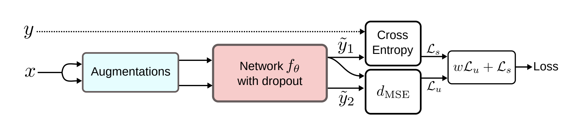 Semi-supervised learning의 목적함수는 supervised loss \( \textit{L}_{s} \) 와 unsupervised loss \( \textit{L}_{u} \) 의 합을 최소화하는 것으로 표현할 수 있다. 그 말인즉슨 supervised, unsupervised를 1-stage로 한큐에 학습한다. 이것이 2-stage로 이루어지는 self-supervised learning, transfer learning 등과의 차이점이다.