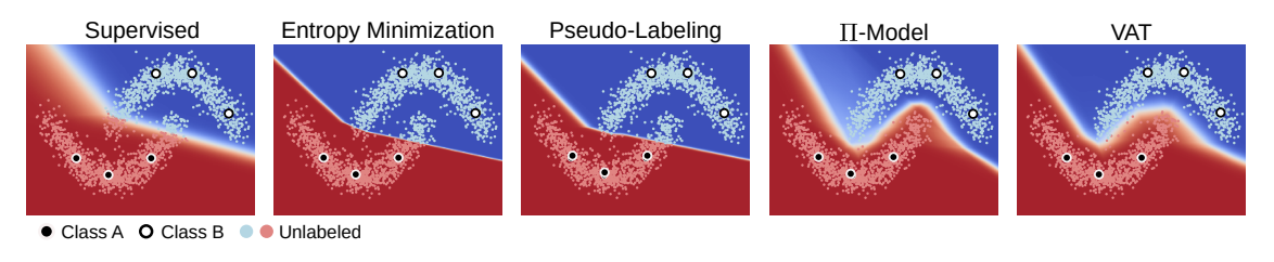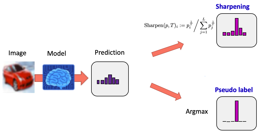 Entropy minimization는 'decision boundary는 데이터의 저밀도 지역에서 형성될 것'이라는 가정에 기초해서 unlabeled data output의 entropy를 minimization하는 기법이다. 간단히 말하면 애매하게 굴지 말고 확실히 해라..이런 느낌이다. 예를 들어 개와 고양이를 분류하려고 할 때, 개 0.6, 고양이 0.4가 나오는 것보다 개 0.9 고양이 0.1 이 나오는 것이 entropy가 더 낮고 이런 방향으로 학습이 되어야한다는 것이다.(=decision boundary 근처에 있는 애매한 애들을 확실하게 구별할 수 있도록) 이 방법은 단일기법으로 사용했을 시 성능이 그리 좋지 못하지만 최신 방법들에 약간의 꼼수(?)로 사용할 때 효과가 좋다. 예를 들면 MixMatch, UDA, ReMixMatch 는 temperature sharpening을 통해 entropy minimization을 간접적으로 사용하고 FixMatch의 경우 pseudo-label을 이용하기 때문에 이또한 간접적 entropy minimization이다. pseudo-label은 왜 entropy minimization이냐 라고 할 수 있는데 pseudo-label을 달 때, argmax()를 통해 one-hot vector로 mapping 시키는 과정이 들어가기 때문이다.
