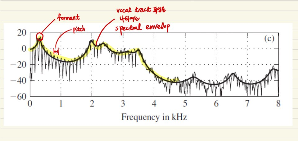 음성신호가 생성되는 원리를 단계별로 표현한 그림이다. 우리가 얻는 샘플링된 신호 s[n]은 사실 유성음이냐/무성음이냐에 따라 유성음일 경우 성대의 진동(pitch)를 주기로 excitied되고 성도(vocal tract)의 반응에 따라 여러 소리를 구성해내는 원리로 소리를 낸다. 무성음일 경우 pitch가 존재하지 않고 그냥 랜덤한 excitation이 성도(vocal tract)의 반응에 따라 여러 소리를 만들어낸다. 이때, 성도의 반응을 시간에 따라 변하는 시스템(=필터)로 보고 이의 필터계수를 음성의 특징을 결정짓는 수치벡터로 볼 것이다.