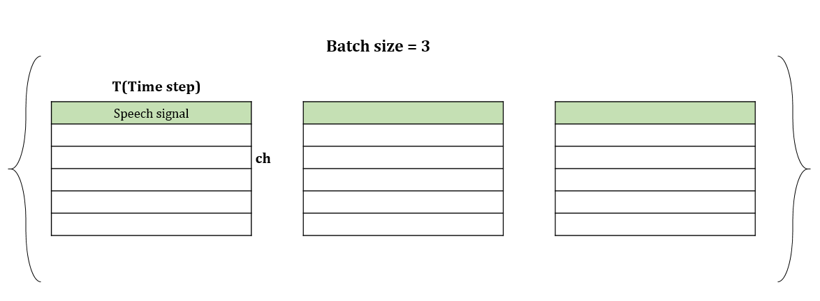 음성의 길이는 T이고 64000 sample이 존재한다. 그리고 microphone개수가 6개여서 ch(channel)이 6인 것을 확인할 수 있다. 그리고 batch는 3으로 설정했다. 그러면 총 차원은 [batch_size, ch, T] -> [3, 6, 64000]이 된다.