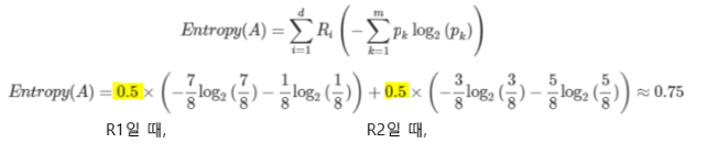 위와 같은 데이터가 존재한다고 하자. 전체 주황박스를 A라고 하고 R1과R2 두개의 부분집합으로 나눈다고 가정한다. 처음 전체 데이터 A에 대한 entropy를 구해보면,