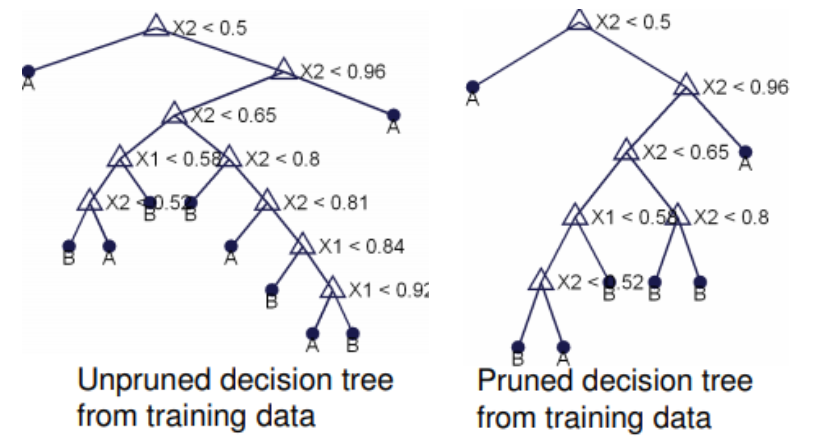 또다른 방법으로는 overfitting문제를 해결하기 위해 가지치기(pruning)를 하는 것이다. 말그대로 전체 트리를 만든다음 오분류율이 다시 증가하는 시점에서 적절히 가지를 쳐주는 것을 말한다.