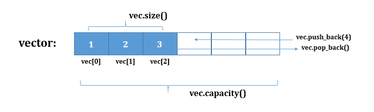 vector가 동적으로 배열을 할당하는 과정을 이해해보자. vector는 맨 뒤쪽에서 삽입과 삭제가 이루어진다. 이렇게 들어간 요소들이 배열의 크기인 vec.size()를 형성한다. 또한 vector자료형은 배열 요소들의 갯수가 증가함에 따라 공간을 점점 늘려가며 할당하므로 배열의 크기보다 더 큰 여유공간을 할당해둔다. 이를 vec.capacity()라고 한다. 벡터가 너무 커져 연속된 메모리를 할당할 수 없을 경우, 다른 메모리로 복사하여 배열을 할당할 수 있다. 아래의 예제를 통해서 벡터에서 자주 쓰이는 함수들을 소개한다.