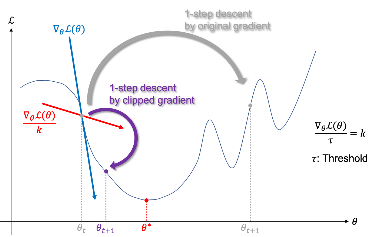 clipping이 없으면 gradient가 너무 뛰어서 global minimum에 도달하지 못하고 너무 엉뚱한 방향으로 향하게 되지만, clipping을 하게 되면 gradient vector가 방향은 유지하되 적은 값만큼 이동하여 도달하려고 하는 곳으로 안정적으로 내려가게 된다.