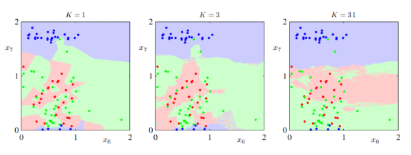 K가 작을수록, 만약 노이즈가 있을 경우 더 민감하다. 왜냐하면 내 근처에 적은 point로만 판단하는데 그 하나하나의 point에 크게 영향을 받기 때문이다. (K가 작을수록, sharp한 decision) K가 클수록, 반대로 노이즈에 덜 민감하게 된다.(K가 클수록, soft한 decision)