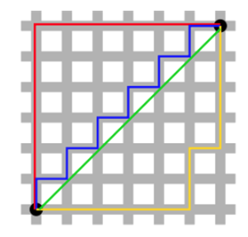 초록색을 제외하고 나머지 경로들은 건물을 가로지르지 않고 최단경로로 가는 방법들이다. 어차피 가로길이 세로길이를 다 더하면 다 같은 값이 나온다. 그래서 단순히 가로의 길이, 세로의 길이를 더하면 맨해튼 거리를 구할 수 있다.