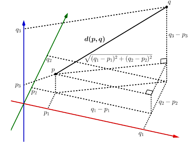 우리에게 가장 익숙한 거리공식일 것 같은 유클리디안 거리이다. L2 distance라고도 부른다.