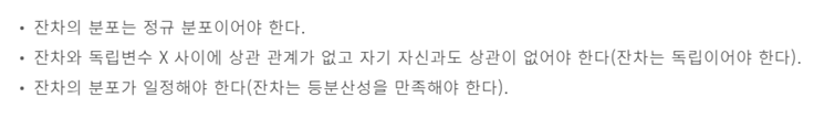 출처의 포스팅에서 말하는 회귀라는 것은 이 residual(무엇에 해당)이 기댓값 0(어디로에 해당)으로 회귀하는 것을 말한다. 우리는 그저 regression modeling을 하고 오차의 합을 최소로 하는 선을 찾는 모델을 회귀모델이라고 생각하지만, 사실은 이 말은 반만 맞다. 왜냐하면 사실 이 모델의 전제조건이 있다. residual이 iid를 만족해야 하기 때문이다. 위의 조건을 만족하지 않으면 오차의 합이 최소라고 해도 회귀모델이 되지 않는다.
