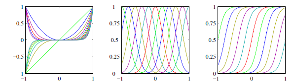 이렇게 최적화방법을 따로 둘 필요없이 해를 구할 수 있었다. 여기서 기저함수 h()는 polynomial이 아닌 가우시안 함수나 sigmoid함수가 될 수도 있다. 비숍의 패턴인식과 머신러닝책에서 여러 basis function의 그래프를 가져왔으니 참고하면 좋을 것 같다.