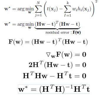 그럼 포물선 형태로 모델링을 했는데 왜 linear regression이냐... 할 수 있지만, 기저함수와 weight의 선형조합으로 target값을 예측했다는 것을 알 수 있다. 그래서 이런 모델링을 linear regression이라고 한다. 좀 더 general하게 추정한 값을 식으로 정리하면 아래와 같다.