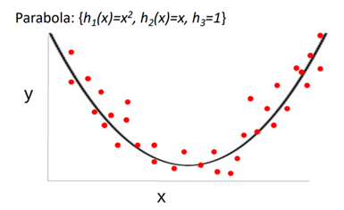 여기서 h라는 함수는 이제 basis function이라고 부를 것이다. x의 기저를 바꾸는 행위를 통해서 데이터를 여러 모양으로 표현가능하다. 만약에 우리가 polynomial(다항식) basis를 사용한다고 하자. 그러면 아래의 그림과 같이 포물선 형태의 모델을 얻을 수 있을 것이다.