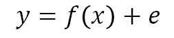 여기서 y가 target이 되겠고 이는 실수값을 갖는 연속형 데이터가 된다. 그리고 원인이 되는 x를 어떤 f()라는 회귀 모델을 이용해서 추정하는 것이다. 하지만 이런 추정을 통해 두 식이 같다고 할 수 없다. 왜냐면 추정이 완벽히 원래 target과 같을 수 없기 때문이기도 하고, 데이터 자체에 잡음(noise)가 있기도 하기 때문이다. 여러가지 요인에 의해 error가 생기게 되고 이를 고려해 위의 등식을 수정하면 아래와 같다.